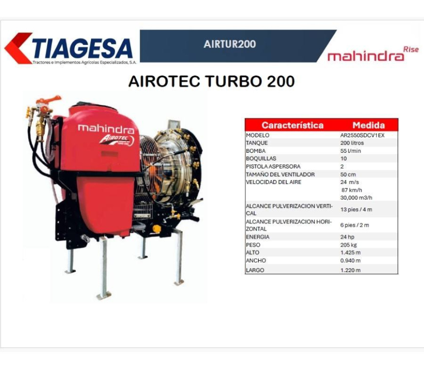 La Airotec Turbo 200 de Mahindra & Mahindra es una pulverizadora tipo atomizador de alta eficiencia, diseñada especialmente para cultivos que requieren penetración profunda y cobertura uniforme, como frutales, café, viñedos y plantaciones en hileras.