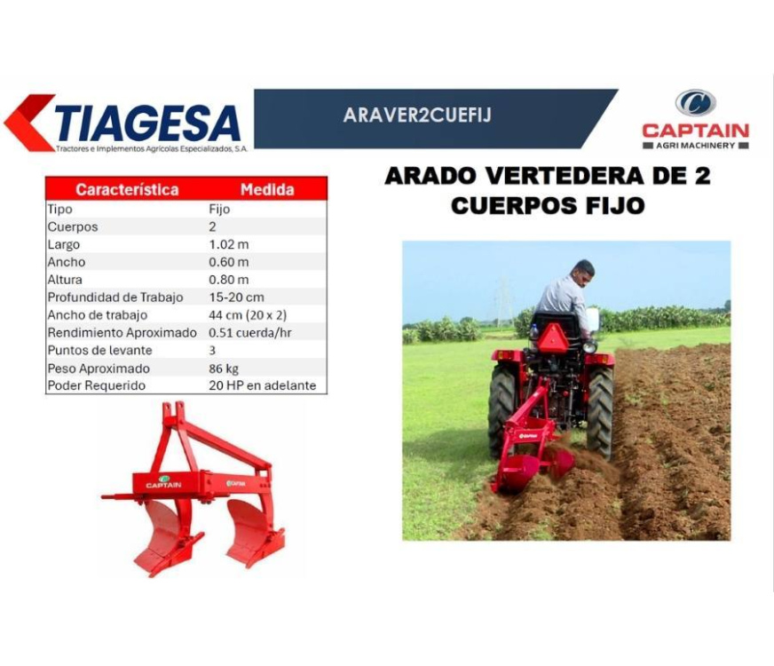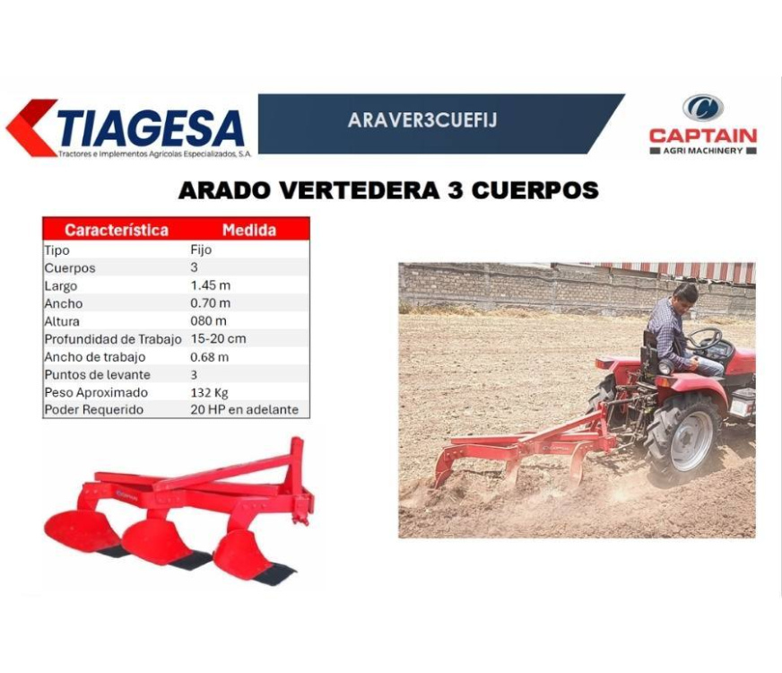 Su función principal es voltear y preparar la tierra para la siembra, asegurando una adecuada aireación y preparación del suelo para un crecimiento óptimo de los cultivos. Este arado es ideal para terrenos que requieren una labor profunda, como suelos pesados, arcillosos o compactados.