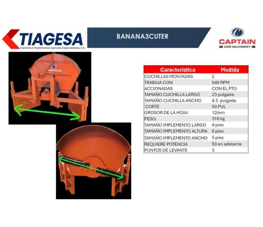 La Banana Cutter de CAPTAIN es un implemento orientado a la cosecha y manejo del cultivo de banano, facilitando el corte rápido y seguro del racimo o tallo durante la recolección.