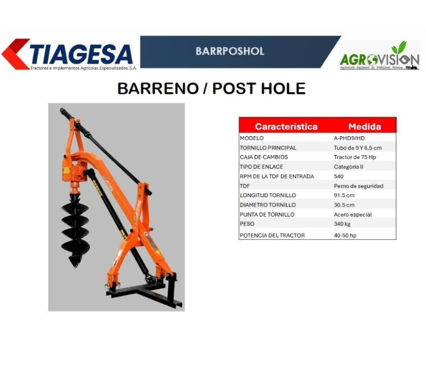 Cuenta con caja de engranajes reforzada, perno de seguridad para protección y enganche de tres puntos, siendo ideal para instalación de postes y cercas .