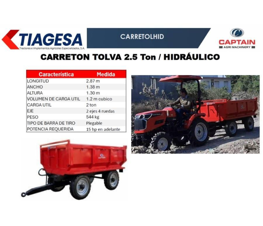El carretón tolva hidráulico de 2.5 toneladas CAPTAIN es un implemento agrícola diseñado para el transporte eficiente de materiales a granel como granos, fertilizantes o residuos.