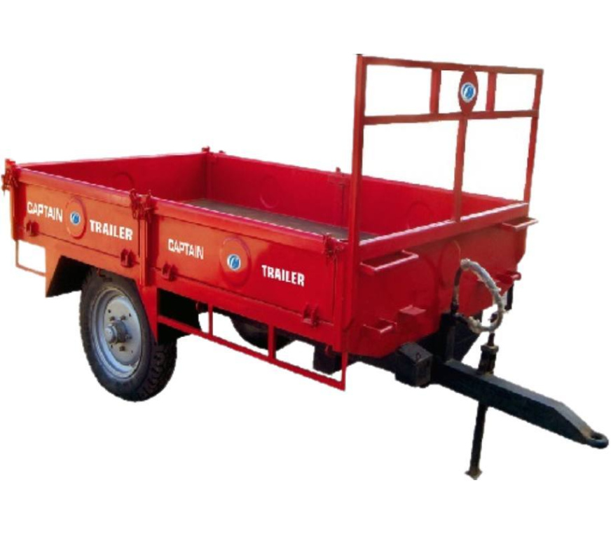 Con sistema de levante hidráulico accionado por el tractor, de 2 toneladas de levante y remolque o tiro, de un eje, caja porta herramientas, extensiones laterales abatibles y luces. MARCA CAPTAIN. HECHO EN INDIA