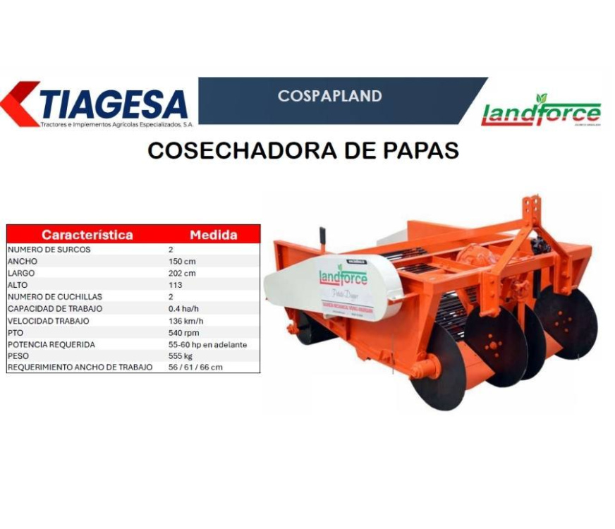 La cosechadora de papas de la marca Land Force es un implemento diseñado para optimizar el proceso de recolección, permitiendo extraer el cultivo de manera eficiente, uniforme y con mínimo daño.