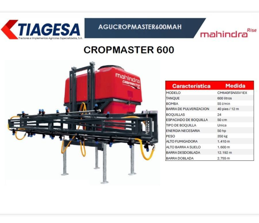 La Cropmaster 600 de Mahindra & Mahindra es una pulverizadora agrícola de alta capacidad diseñada para operaciones de mayor escala, ofreciendo máxima cobertura, precisión y eficiencia en la protección de cultivos.