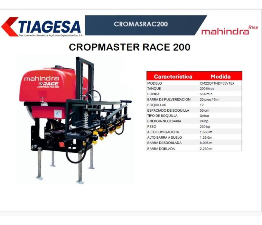 Fabricada con materiales resistentes y un tanque de alta durabilidad, la Cropmaster Race 200 está pensada para ofrecer larga vida útil, bajo mantenimiento y máxima eficiencia, convirtiéndose en una solución confiable para productores que buscan precisión y rendimiento en sus aplicaciones agrícolas