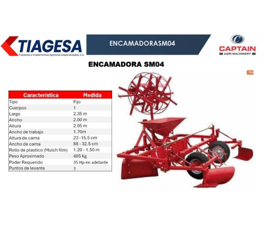Este equipo es útil en áreas con poca mano de obra disponible ya que elabora la cama de siembra, coloca doble cinta de goteo e instala el mulch o plástico cobertor a la vez, con un total de 3 personas y accesorio para fertilizar