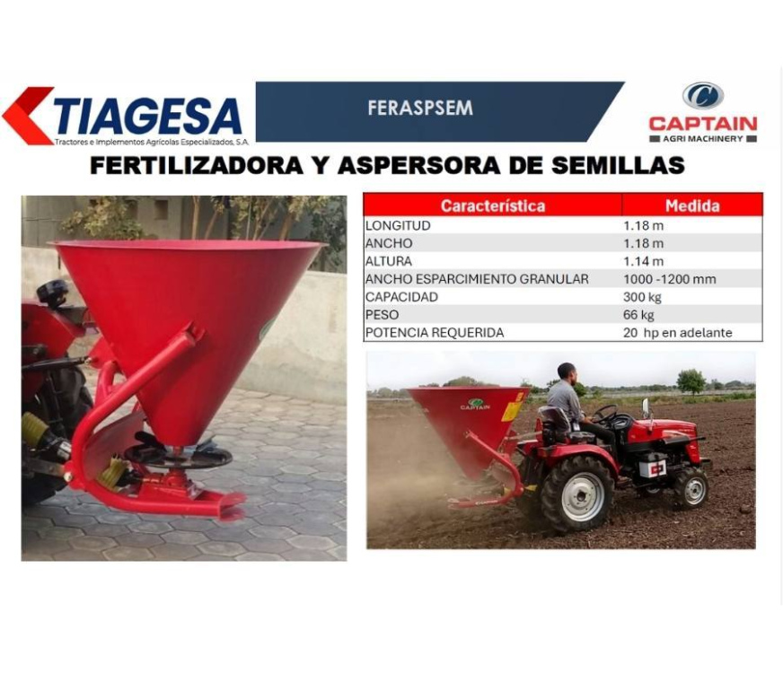 Capitán Fertilizer Broadcaster es un implemento de tecnología moderna diseñado para esparcir fertilizantes con mayor facilidad y eficiencia.Su sistema único de distribución asegura la distribución uniforme de los fertilizantes en grandes distancias.