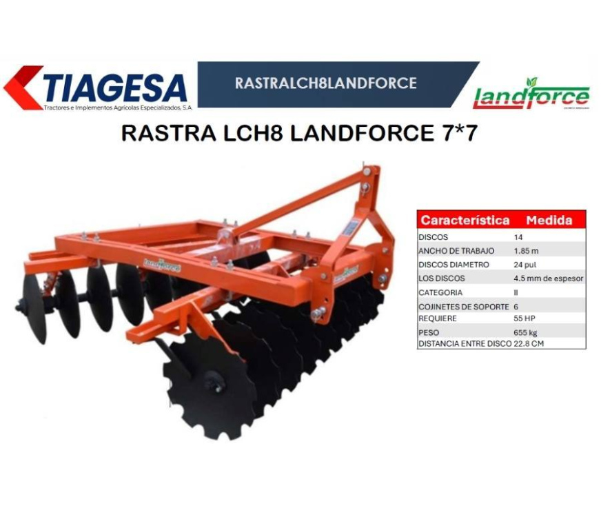 La rastra montada de 7x7 discos marca Land Force es una herramienta compacta pero poderosa, diseñada especialmente para pequeños y medianos productores que buscan una labranza eficiente sin necesidad de grandes tractores. Su sistema de montaje en tres puntos permite un acoplamiento rápido, práctico y seguro.