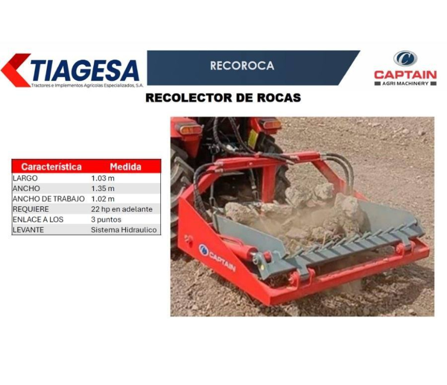 El recolector de rocas (rock picker) de CAPTAIN es un implemento diseñado para remover, recoger y limpiar piedras del terreno, mejorando la calidad del suelo y protegiendo otros equipos agrícolas.