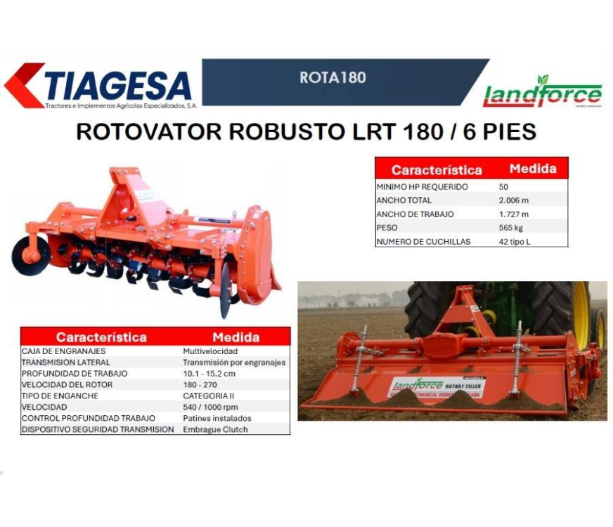 El Rotovator Robusto LRT 180 (6 pies) de Land Force es un implemento agrícola de alta resistencia, diseñado para trabajos exigentes en la preparación de suelo. Pertenece a la línea Robusto, reconocida por su durabilidad y desempeño en condiciones difíciles como terrenos compactados o con abundante residuo vegetal.