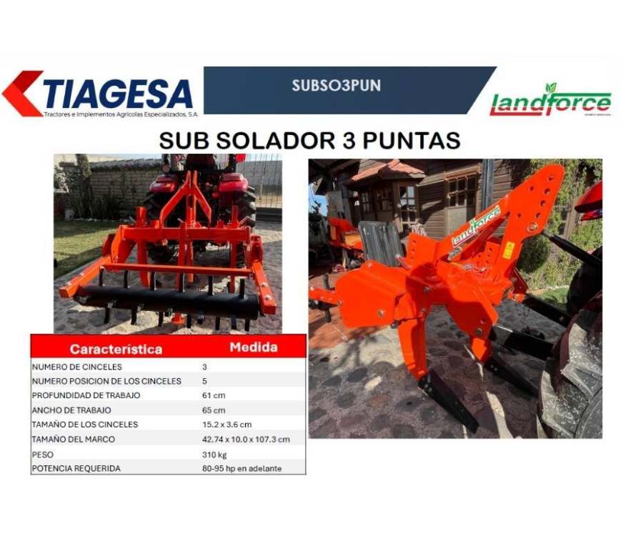 El Subsolador de 3 puntas de Land Force es un implemento agrícola diseñado para realizar labores de subsolado profundo, rompiendo capas compactadas del suelo sin voltear la superficie. Es ideal para mejorar la estructura del terreno en condiciones donde el arado convencional no logra penetrar.
